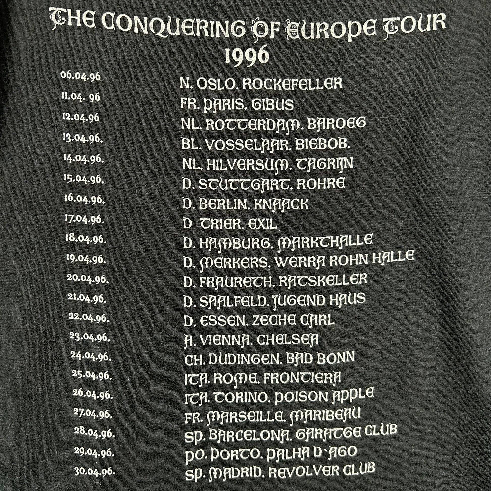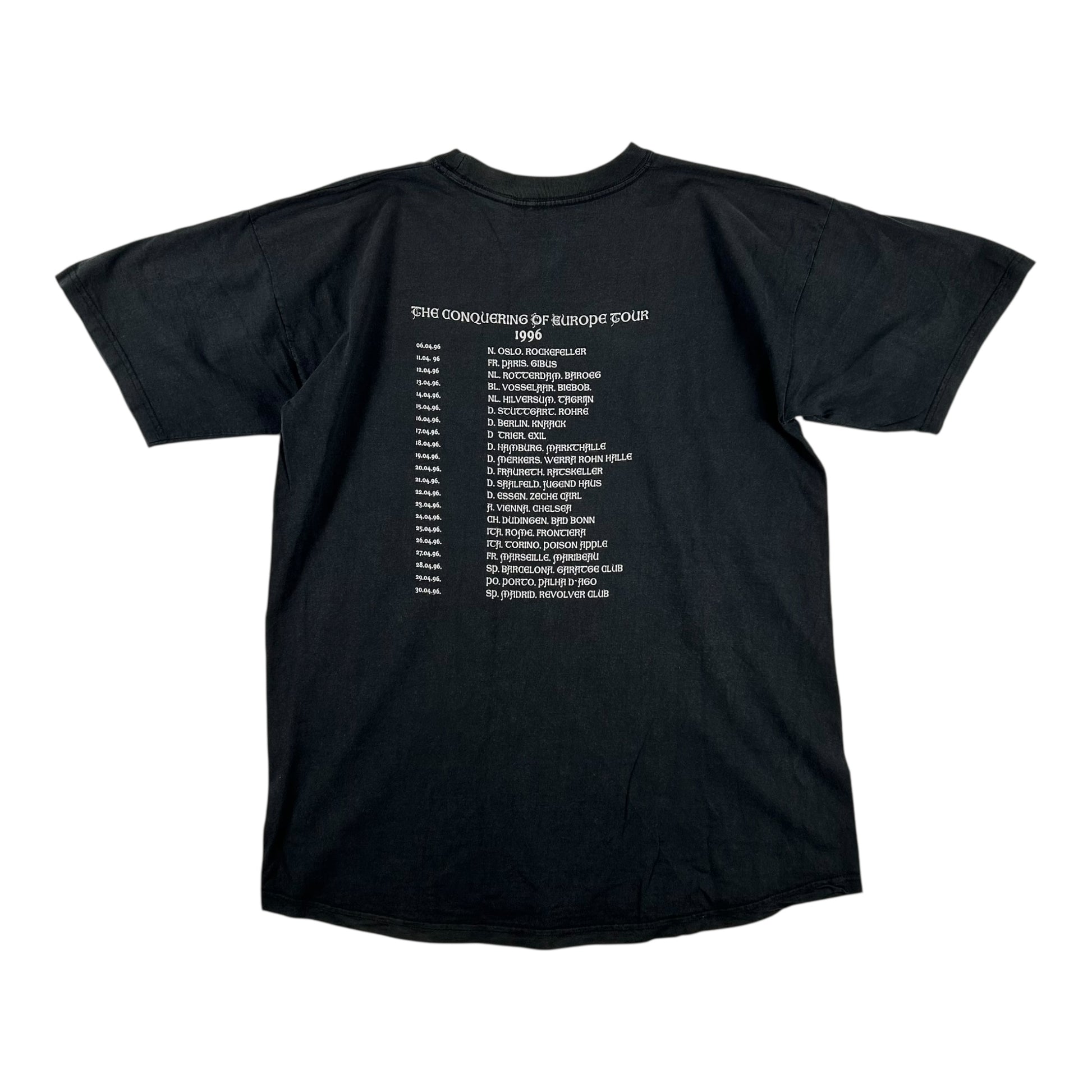 Tour tee from the band’s pivotal 1996 European run supporting their landmark album Nemesis Divina (released April 1996). Black metal in its purest form!
